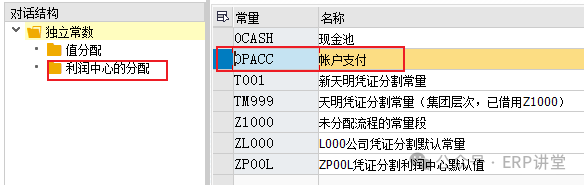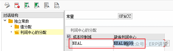 3.编辑未分配流程的常量 事务代码:SM30 - V_T8G41A 系统路径:IMG→财务会计->总账会计->业务交易->凭证拆分->编辑未分配流程的常量 配置目的:维护默认的利润中心 配置屏幕: 选中常量,双击“利润中心的分配” 维护成本控制范围下的默认利润中心,一般维护虚拟利润中心;