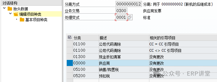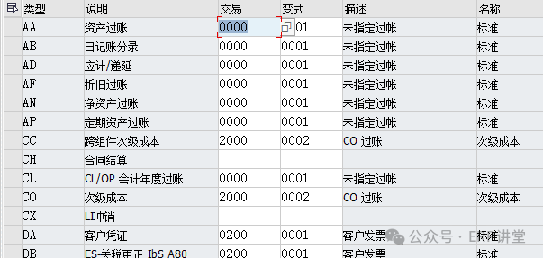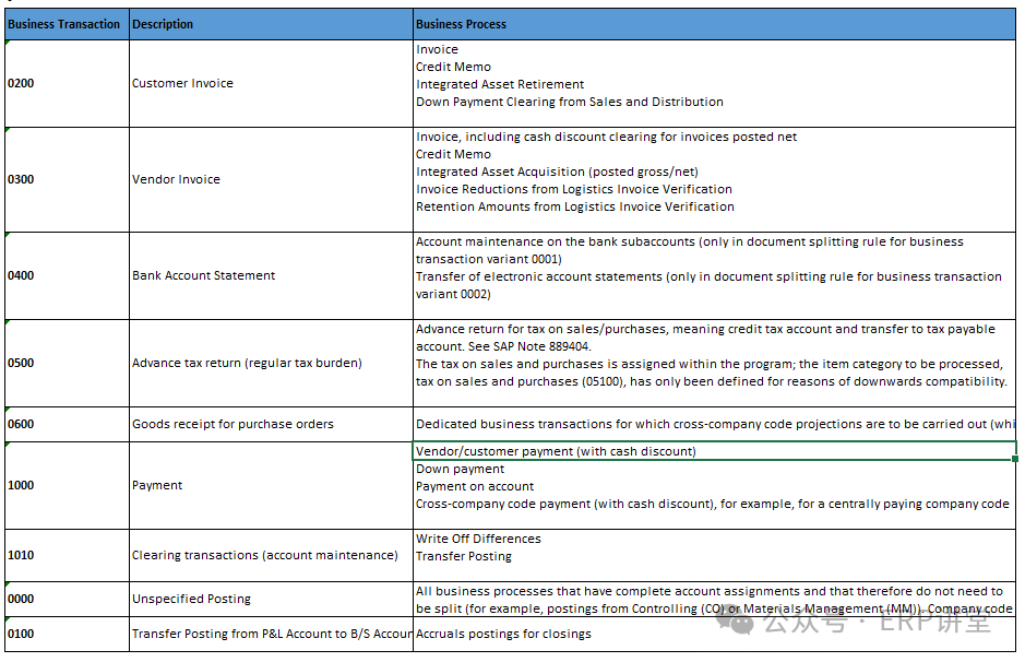 6.定义总账会计核算的凭证分解特征 事务代码:SM30 - V_T8G12 系统路径:IMG→财务会计->总账会计->业务交易->凭证拆分->为文档拆分给文档类型分类 配置目的:维护凭证类型对应的业务交易和交易变式 配置屏幕: 一般使用系统交付的标志配置,如果有新建的凭证类型,才需要维护; 我们在凭证录入的时候,会有不同的凭证类型,比如录入供应商发票KR,支付供应商货款KZ等等,可以简单理解成Business Transaction就是对应到了实际操作中的某一项或某一类业务。同样,这也是系统预定义好了,我们不能去自定义。