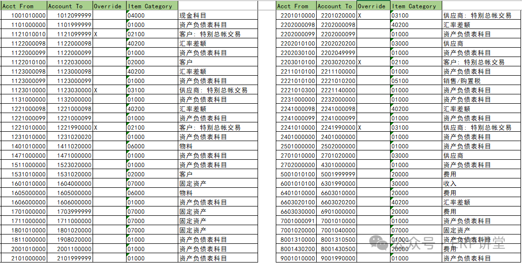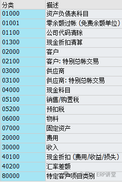 7.为凭证拆分给总分类账科目分类 事务代码:SM30 - 系统路径:IMG→财务会计->总账会计->业务交易->凭证拆分->为凭证拆分给总分类账科目分类 配置目的:维护会计科目对应的项目类别 配置屏幕: 维护哪些科目需要执行凭证分割,为需要凭证分割的科目设定分类; 分类:实际上就是对会计科目的一个分组,凭证分割的程序通过凭证中的会计科目来定位项目类别,并来进行后续逻辑。 SAP 预定义项目类别: 至少要将会计科目分配到如下行项目类别: 资产负债类会计科目:维护 01000-资产负债表科目 银行存款类科目:维护04000-现金科目 费用类科目:维护20000-费用 收入类科目:维护30000收入 其他类型的会计科目,系统已经自定义了,可以通过表T8G16查看。