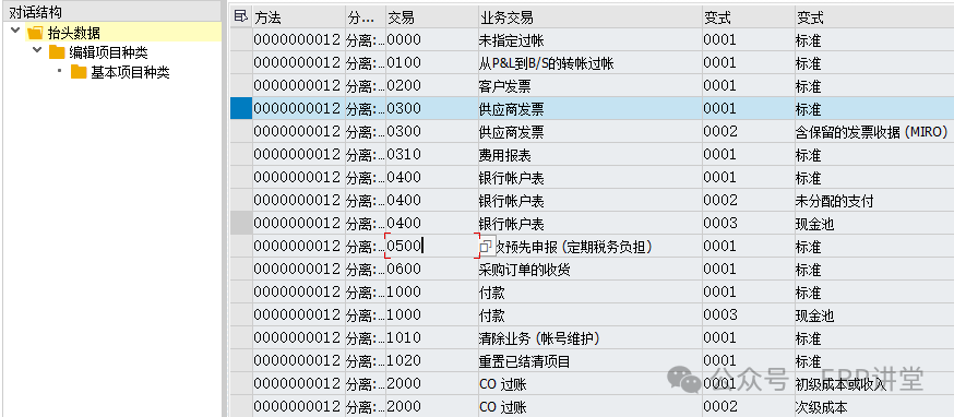 8.定义凭证拆分规则 事务代码: 系统路径:IMG→财务会计->总账会计->业务交易->凭证拆分->激活凭证分解 配置目的:激活公司代码的凭证分割 配置屏幕: 一般使用SAP预定义的配置,不用修改; 根据业务交易+变式,确定要分割的行项目; 基本项目种类,确定要分割的行项目根据什么规则进项分割: