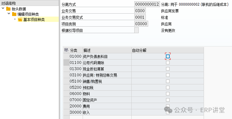 被动分割:根据主动分割的结果进项记账时,系统进项分割;例如,付款清账中,付款的银行科目的分割时基于被清账的应付账款行项目中集成的,该分割规则是系统固定的不需要配置;