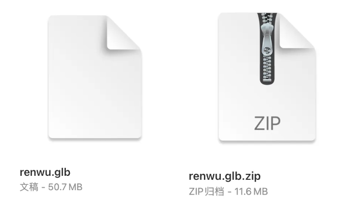 使用draco压缩之后导致的模型撕裂 3.2 进阶方案高端的食材,往往只需要采用最朴素的烹饪方式。经过一些尝试,我们发现将glb模型直接打成zip包可以明显的提升模型的压缩效率。50.7mb的人物模型可以压缩到11.6mb。