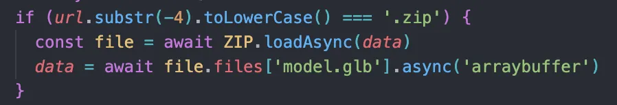 但是Three.js提供的gltfloader是不能直接加载zip文件的,于是我们需要对其进行功能扩展。 Three.js加载gltf模型是首先通过fetch请求获取到模型的arraybuffer,再对arraybuffer进行格式化。所以我们只需要在模型格式化之前拦截zip文件进行解压缩即可。