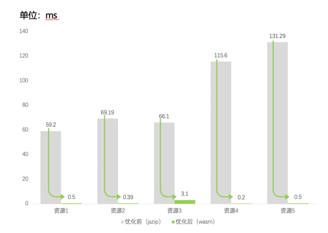 看起来还不错,在保证视觉效果的同时又可以大幅压缩模型的体积,那么有没有可能做的再极致一些呢? 既然是针对性的场景,我们就可以从解压缩的解算开始入手,于是我们使用rust写了一个解压工具,将其转换成wasm包代替jszip,可以发现wasm的冷启动性能确实要比js好很多,可以将解压的时长从几十到100毫秒降低到1毫秒左右,适合体积比较小的解压缩场景。