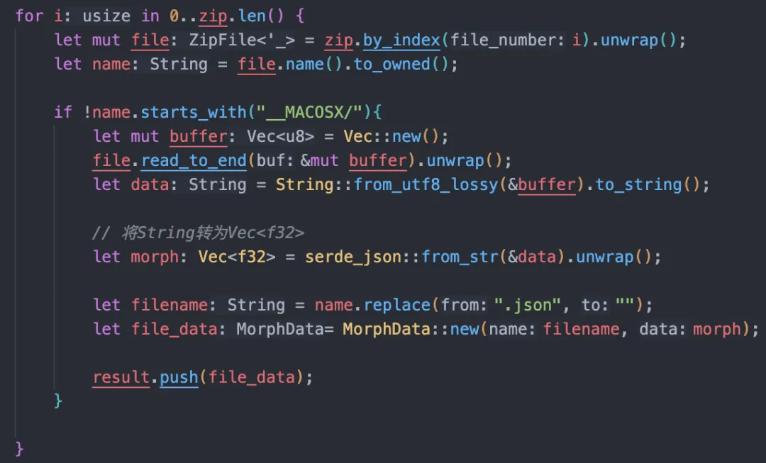 通过这种方式成功的将首帧渲染的时间从7秒缩短到0.6秒,大幅的提升了用户的体验。 讲到这里,大家可能发现了,虽然首帧渲染的时长缩短了,但是形态键缓存的资源有80mb,压缩后也有15mb,这块的时长可不可以继续压榨呢,先看一下资源的处理流程,处理解压后的文件需要将文件解析成JSON字符串,然后在转换成float32array,这里耗时最大的点就是JSON.parse的操作,有没有更好的方式处理呢,可以将这部分内容丢到rust里面,平均可以减少0.5s的时间。