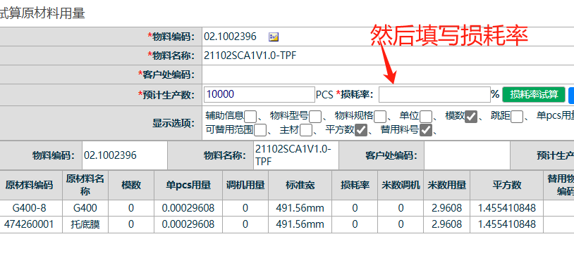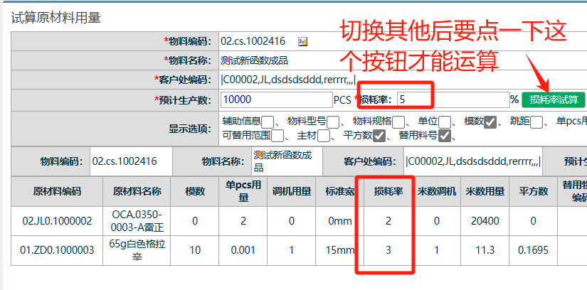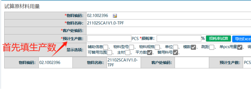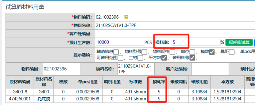 ![]() ![]() 点击进入 如下图: ![]() 点中一个料号后,再点击试算按钮 如下图: ![]() 首先填写要生产的数量 如下图: ![]() 如果要计算不同的损耗率时的结果,填上 如下图: ![]() 损耗率不为0时进行损耗率试算,如果为空或为0时按原本bom的明细来进行试算 如下图: ![]() 如果要换下一个料来试算,点击料号旁边的正方框进行选择 如下图: ![]() 切换成了其他料号后,要点损耗率运算按钮才能按所填的损耗率来试算 如下图: ![]() 点晴模切ERP更多信息:http://moqie.clicksun.cn,联系电话:4001861886 该文章在 2024/10/11 14:37:27 编辑过 |