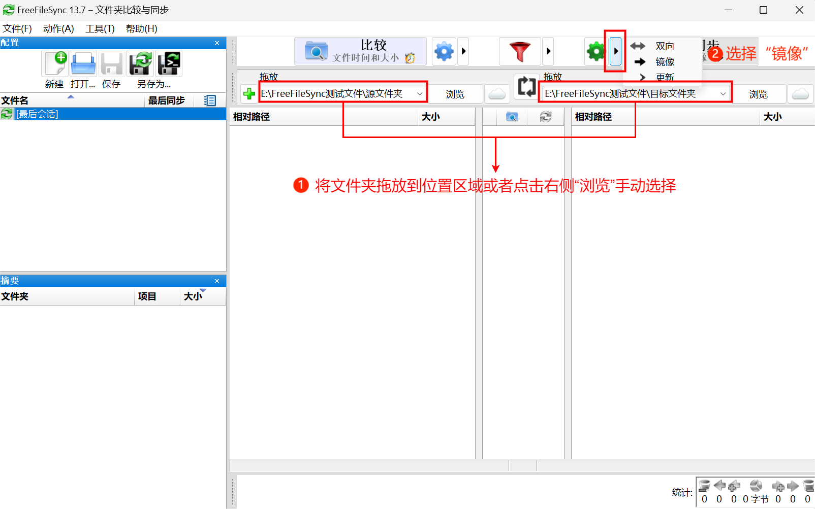 首先,我们将两个文件夹导入对应的操作区,并将同步模式改为:镜像。