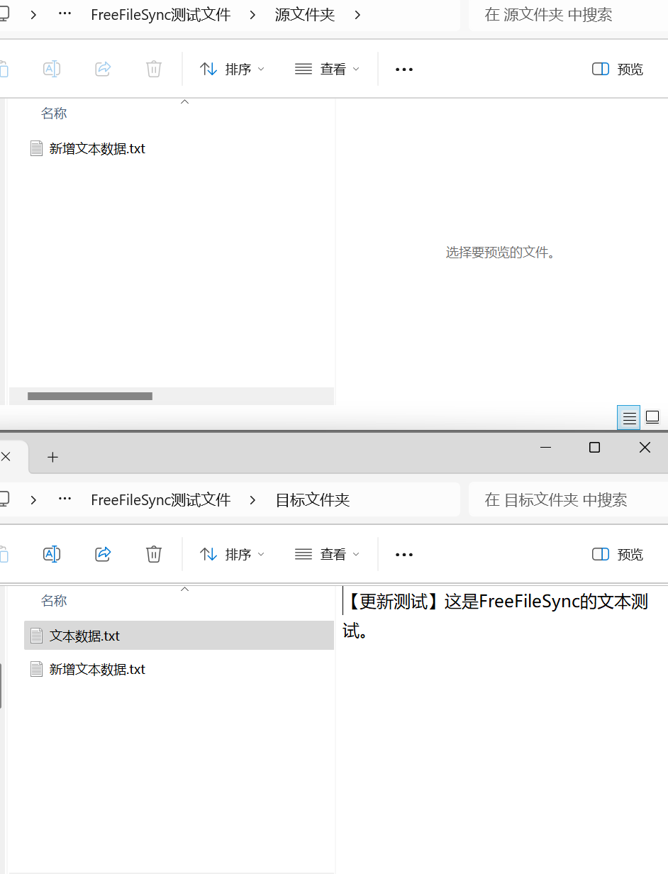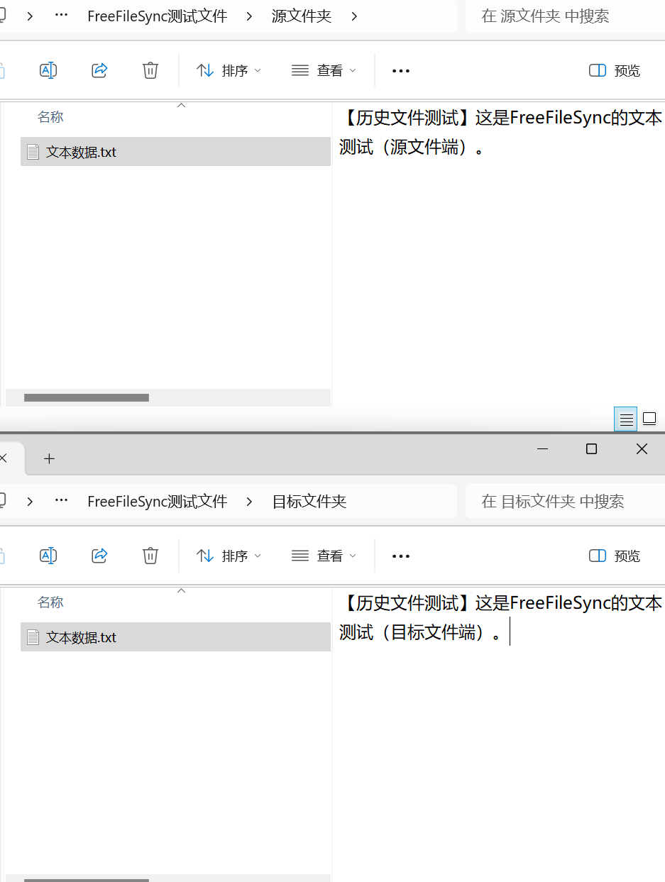 保持两个文件夹 "文本数据.txt" 内容一致;