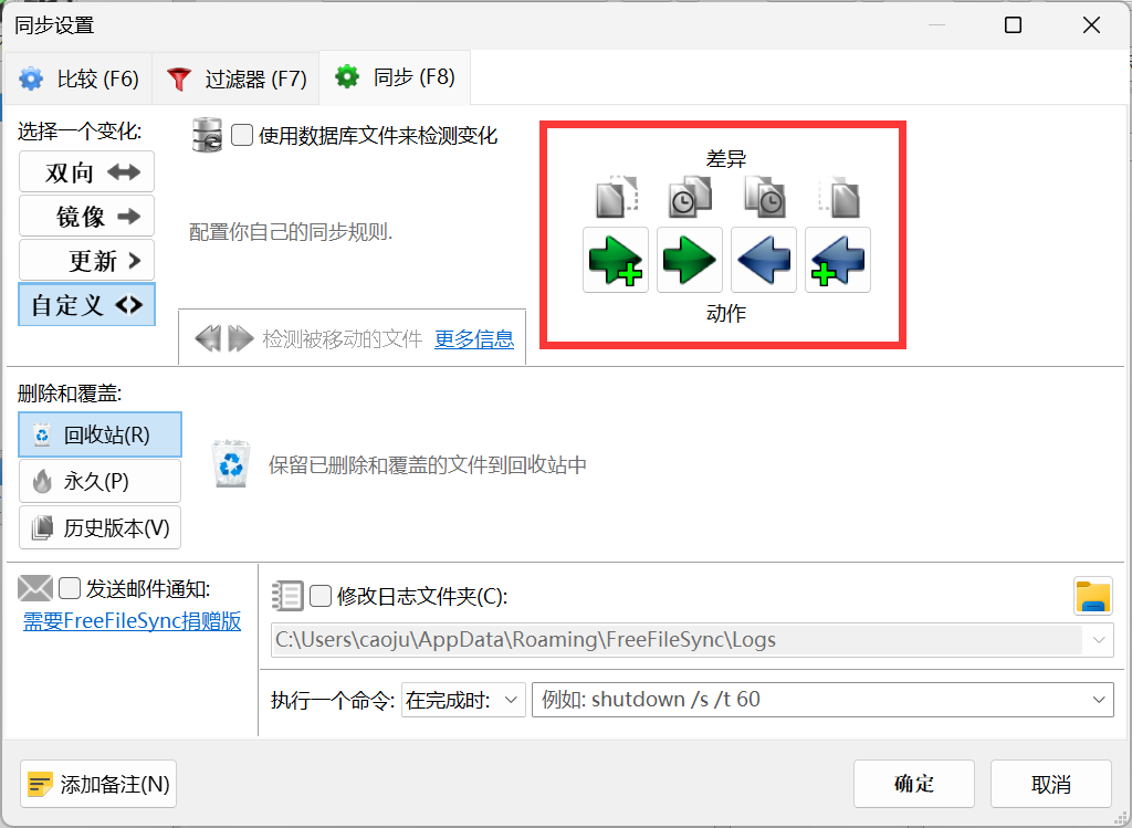 自定义模式即让我们可以制定属于适合自己的同步策略。 根据在文件同步过程中出现的各种差异我们可以选择不同的处理操作,这里不过多赘述。