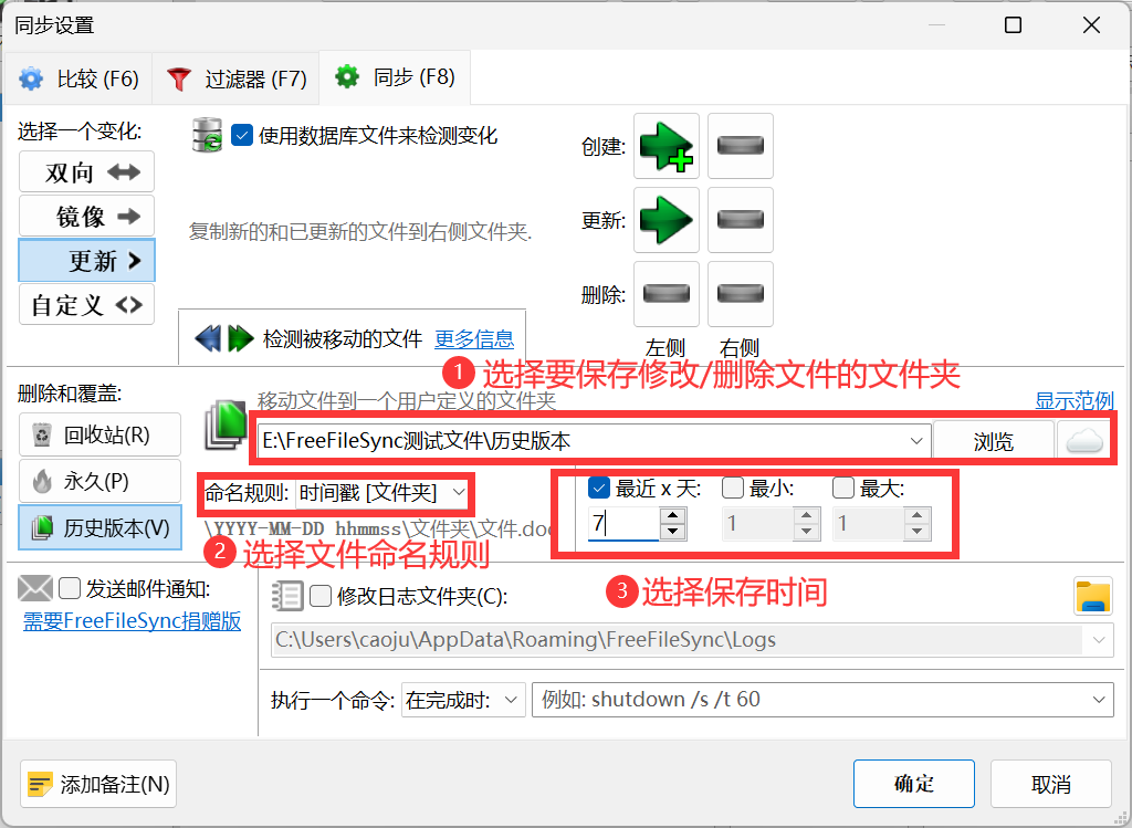 数据备份一般选择更新模式;文件同步一般选择双向模式。