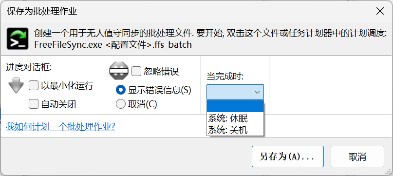 另外,我们也可以选择将其保存为批处理作业,之后只要点击保存的批处理文件,就可以执行预设的操作,帮助我们更高效的完成文件同步操作。