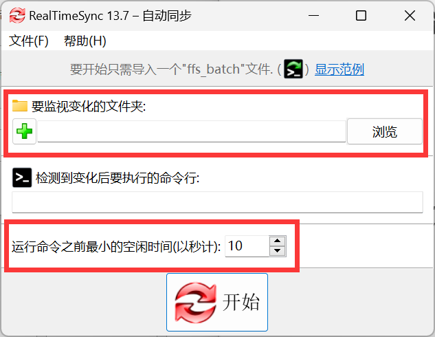 打开RealTimeSync ,将要定时处理的批处理文件拖入命令行,设置好时间,点击“开始”,即可开启软件的实时检测,当检测文件夹一旦变动,就会执行预设的同步操作。