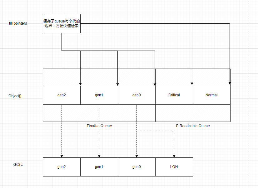 与GC分代一样,也分为3个代和LOH。当一个对象在GC代中移动时,对象地址也需要也需要在finalization queue移动到对应的代中.