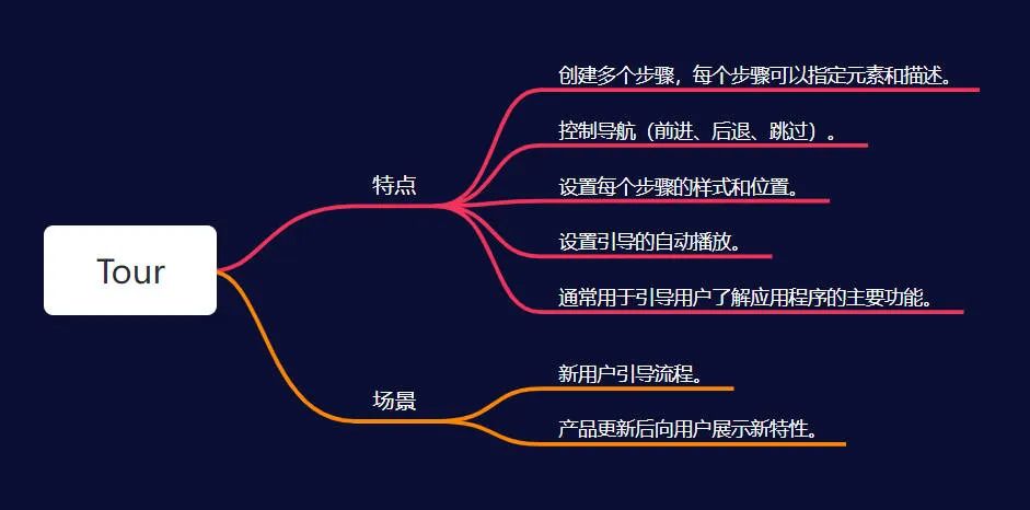 Tour 是一个引导用户通过应用程序或网站的功能点的向导。它通常用于新用户引导、功能演示或突出新功能。