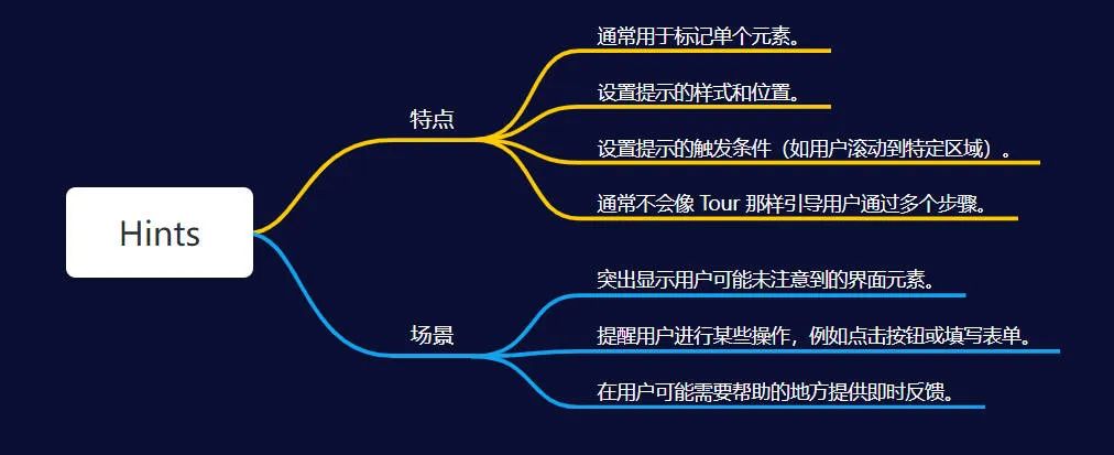 Tour 更适合于全面的用户引导,通过一系列的步骤来展示应用程序的不同部分。Hints 更适合于提供快速的提示和反馈,通常用于标记特定的界面元素。根据需求选择使用。
