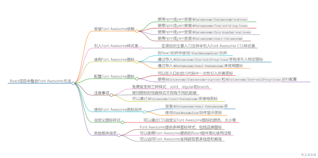 使用 npm 或 yarn 命令安装 Font Awesome 的 React 组件以及所需的图标样式包。例如,如果您需要免费的固态图标,可以安装以下包: