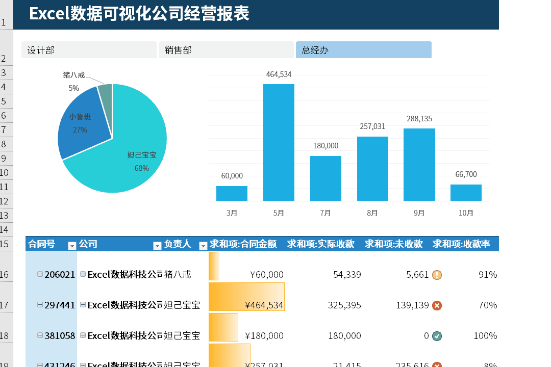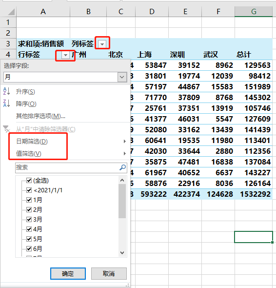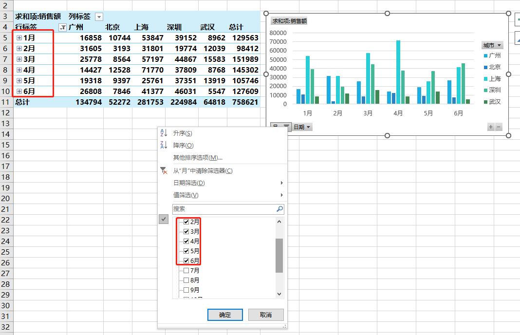 数据透视表的数据也自动变成了筛选1-6月数据,所以它们的筛选是同步变化的。