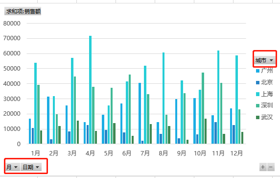 如果我们给透视表插入了图表,生成数据透视图,透视图上会呈现行标签或列标签的字段按钮。