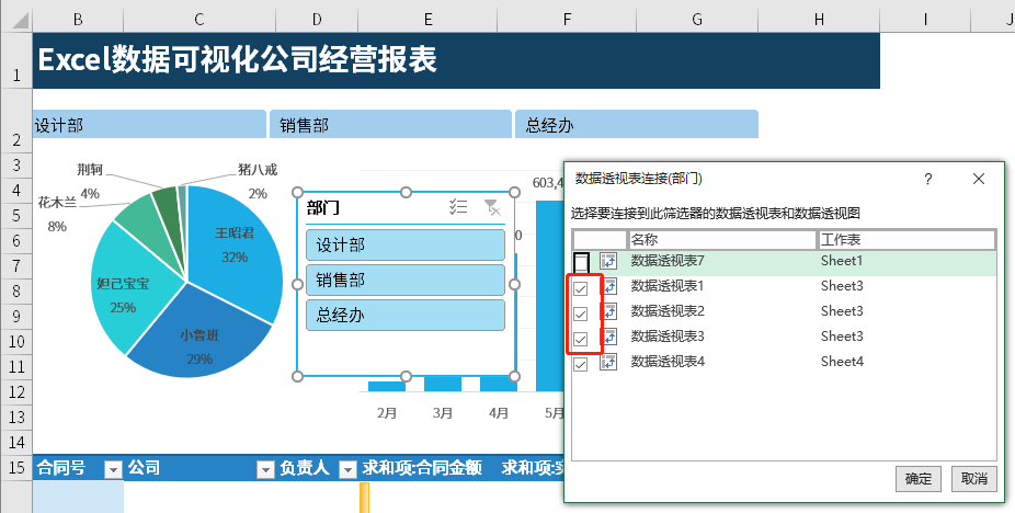 链接多个数据透视表,选择切片器,右击-报表链接,把其他的透视表打上√。