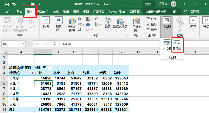 当我们选择数据透视图,或透视表时,选择【插入】,筛选器中【日程表】。