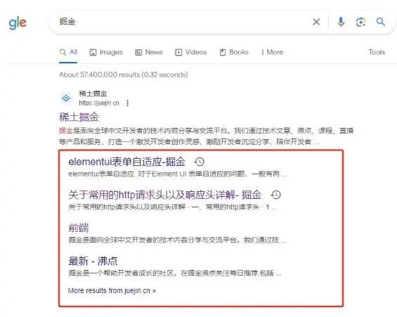 7.数据结构化标记结构化数据标记并不能直接帮助提高搜索排名,但它能带来很多好处: (1)丰富搜索结果比如搜索 掘金 出现的页面,红色框部分就是结构化标记的成果,从框内可以更好的了解该网站的内容,而且占据了大版面也有利于吸引用户注意。