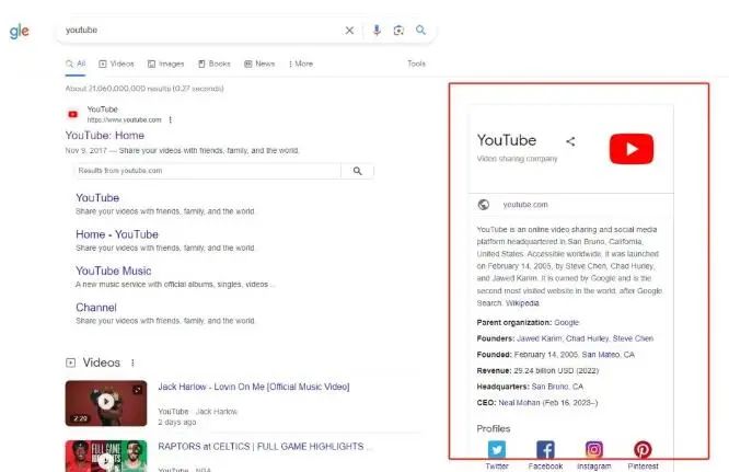 (2)拥有知识面板在右侧会有个知识面板,该面版可提供更高的品牌知名度和权威性,如下图的右侧红框: