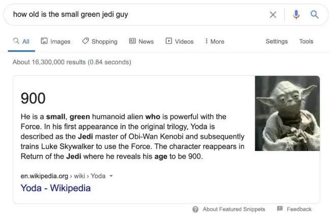 (3)支持语义搜索不再是关键词的匹配搜索,而是通过关键词去寻找问题的答案。当你搜索如下模糊内容时,Google 会通过这种方式设法返回合适的结果: