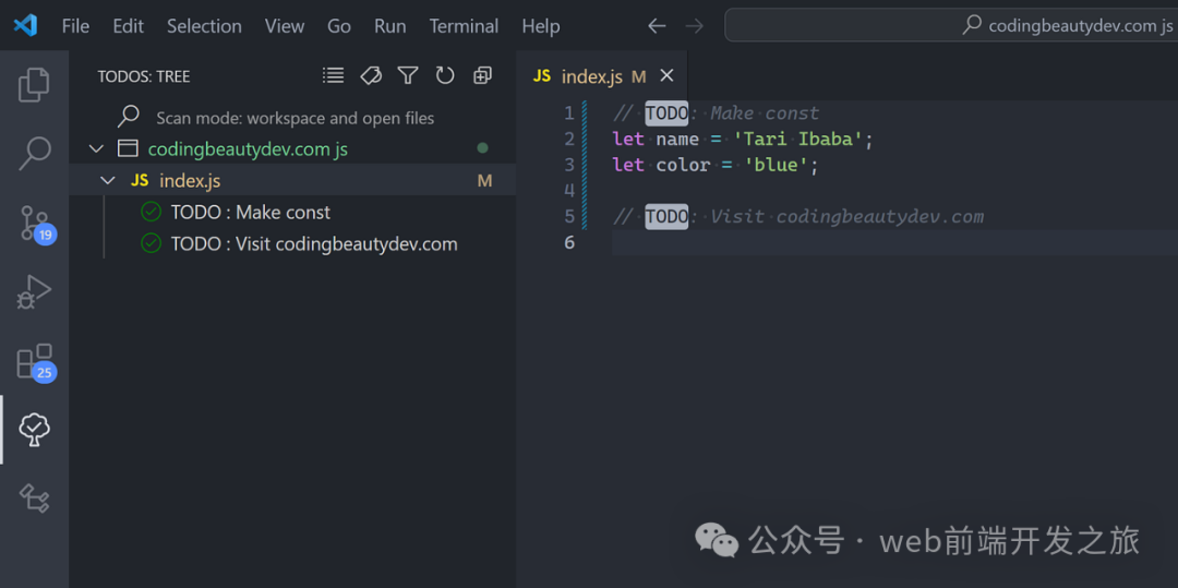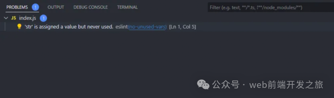 我们还可以使用 Problems 选项卡查看当前 VS Code 工作区中每个文件的所有错误。