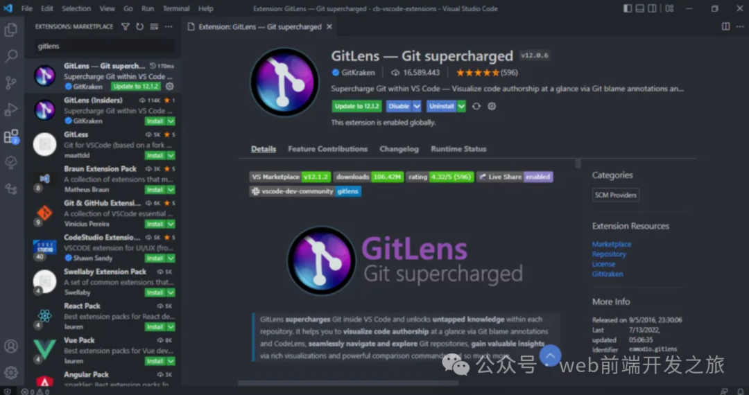 GitLens 是另一个强大的扩展,可帮助您充分利用 Visual Studio Code 中的 Git 源代码控制。