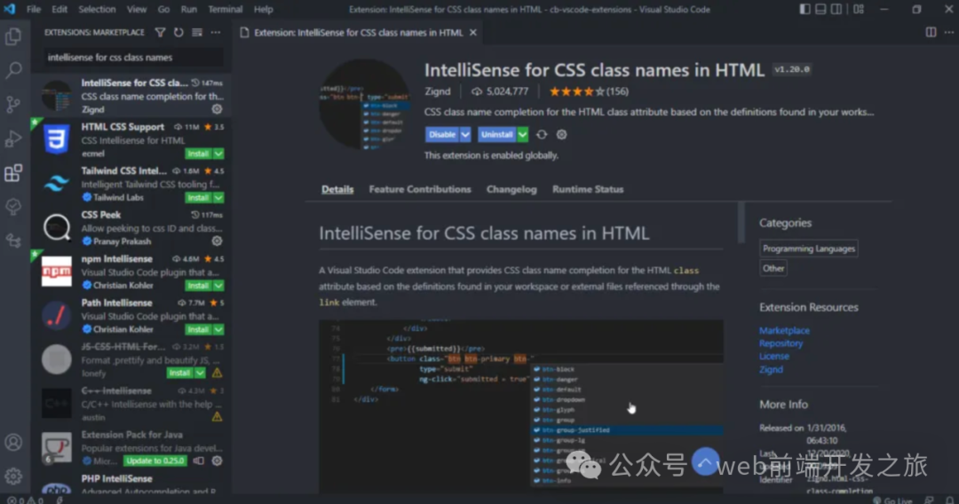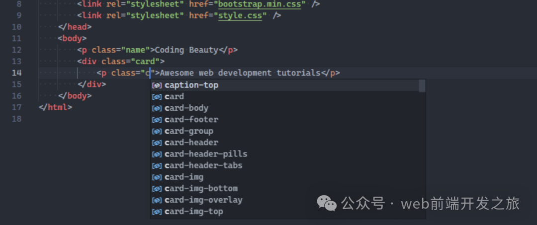 HTML 中 CSS 类名的 Intellisense 与 CSS 速览协同工作。从当前工作区中找到的现有 CSS 定义为 HTML 类属性提供代码完成。