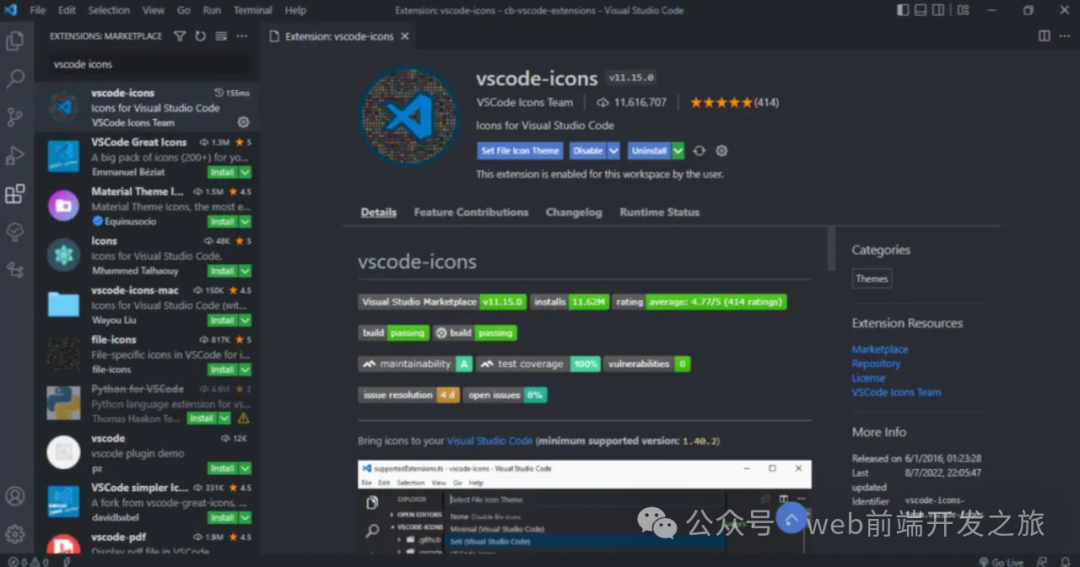 图标包可用于自定义 Visual Studio Code 中不同类型文件的外观。它们增强了应用程序的外观,并使其更容易识别和区分各种文件。VSCode Icons 是最受欢迎的图标包扩展之一,拥有一组非常全面的图标和超过 1100 万次下载。