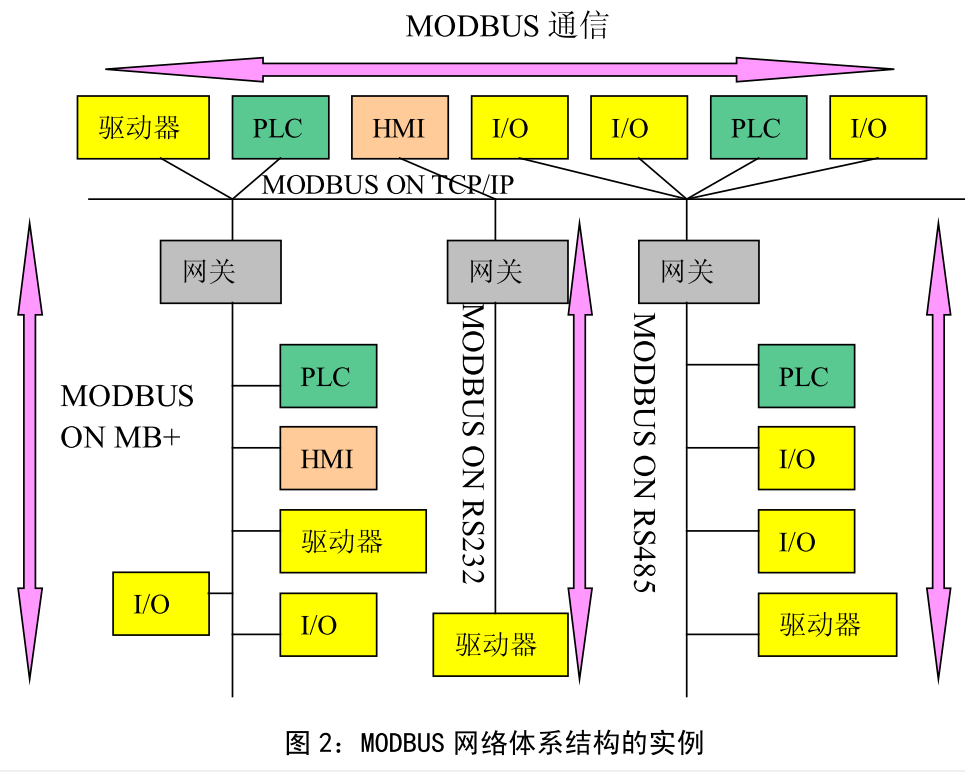 - Modbus可以支持多种电气接口,如RS-232、RS-485等,还可以在各种介质上传送,如双绞线、光纤、无线等。