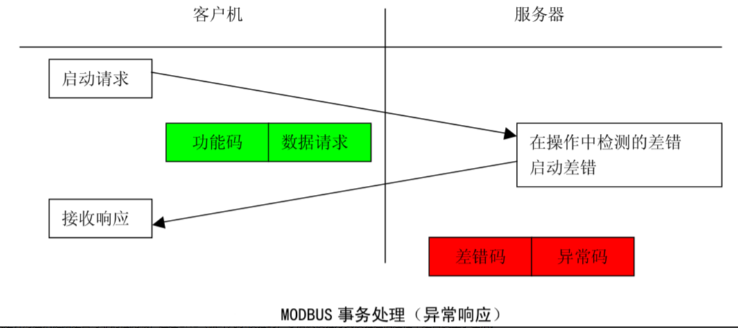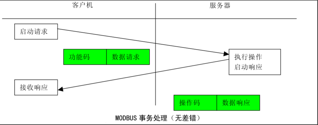 其中事务处理正常时,客户机向服务器发送请求,在功能码中填充功能码代号,说明服务器需要执行的动作,在数据码区填充具体的要求,比如读寄存器的地址和数量,通信正常时服务器会在返回的通信帧的功能码区中填充一个操作码,该操作码=功能码,在通讯帧的数据区填充返回的采样数据。