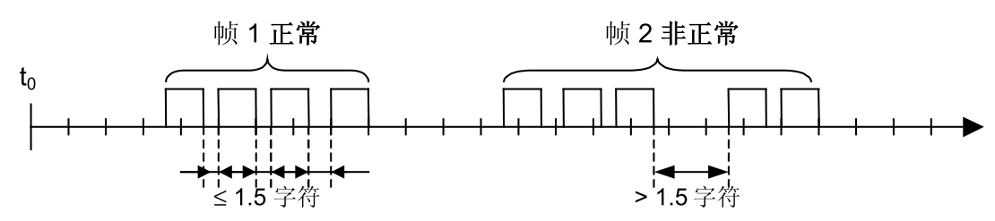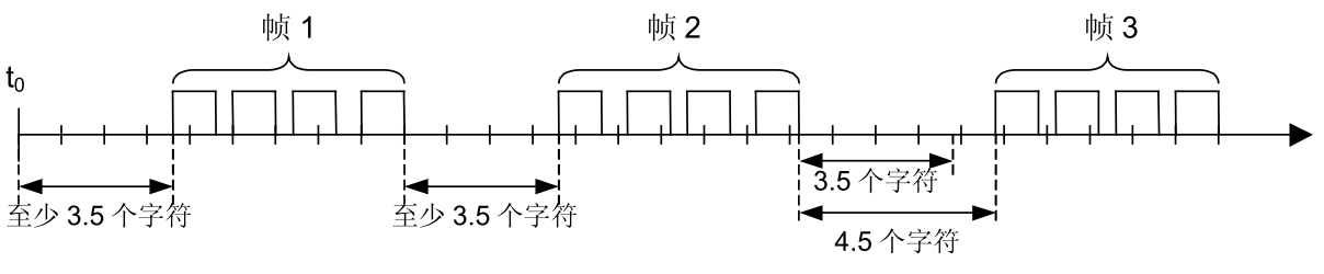 - RTU 模式,数据帧之间必须至少间隔 3.5 个字符时间,通过时间区间来区分报文,如下: