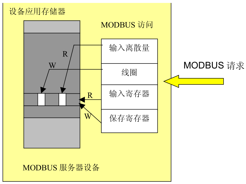 Modbus 协议允许设备将四种数据类型分别映射到不同的存储区块中,各个区块之间相互独立,使用不同的功能码可读取到不同的数值,如下图所示