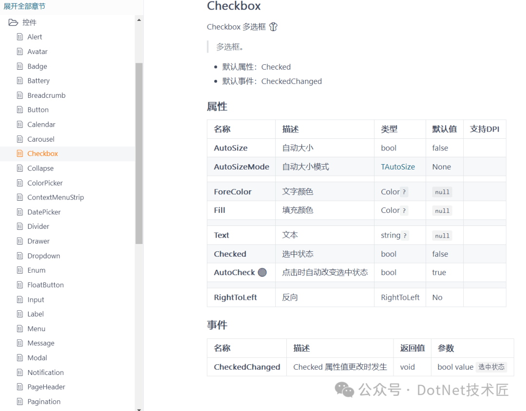 控件具体使用说明,包括介绍、属性、事件等内容,具体如下图所示: