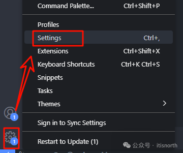 4. 打开 VSCode,点击左下角的齿轮图标,然后选择“Settings”。