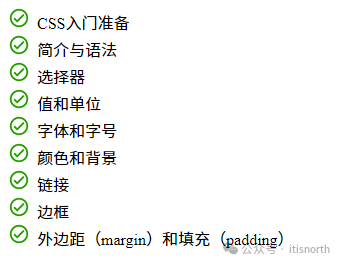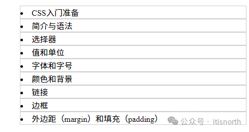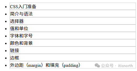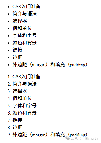 <ul>   <li>CSS入门准备</li>   <li>简介与语法</li>   <li>选择器</li>   <li>值和单位</li>   <li>字体和字号</li>   <li>颜色和背景</li>   <li>链接</li>   <li>边框</li>   <li>外边距(margin)和填充(padding)</li> </ul> <ol>   <li>CSS入门准备</li>   <li>简介与语法</li>   <li>选择器</li>   <li>值和单位</li>   <li>字体和字号</li>   <li>颜色和背景</li>   <li>链接</li>   <li>边框</li>   <li>外边距(margin)和填充(padding)</li> </ol>