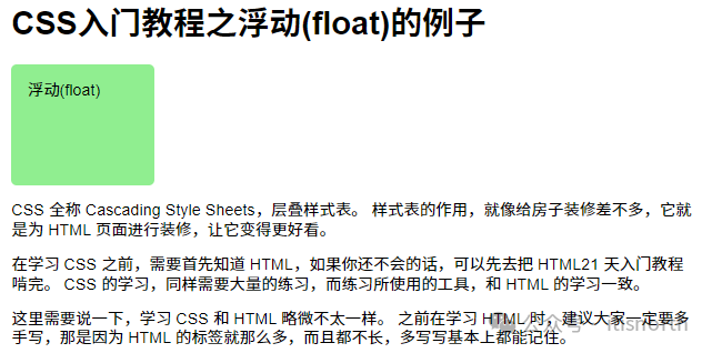 <h1>CSS入门教程之浮动(float)的例子</h1> <div class="float-box-1">浮动(float)</div> <p>   CSS 全称 Cascading Style Sheets,层叠样式表。   样式表的作用,就像给房子装修差不多,它就是为 HTML   页面进行装修,让它变得更好看。 </p> <p>   在学习 CSS 之前,需要首先知道 HTML,如果你还不会的话,可以先去把 HTML21   天入门教程啃完。 CSS 的学习,同样需要大量的练习,而练习所使用的工具,和 HTML   的学习一致。 </p> <p>   这里需要说一下,学习 CSS 和 HTML 略微不太一样。 之前在学习 HTML   时,建议大家一定要多手写,那是因为 HTML   的标签就那么多,而且都不长,多写写基本上都能记住。 </p>