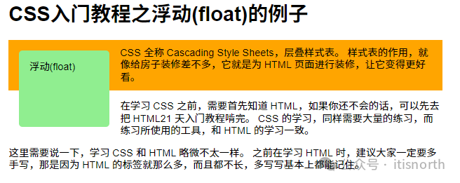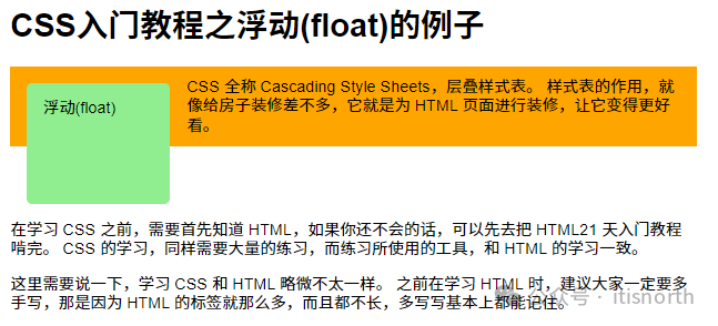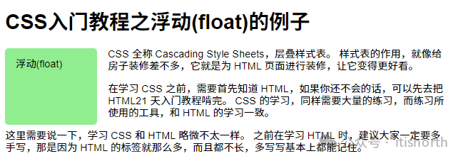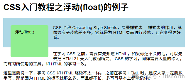 <div class="wrapper-1">   <div class="float-box-3">浮动(float)</div>   <p>     CSS 全称 Cascading Style Sheets,层叠样式表。     样式表的作用,就像给房子装修差不多,它就是为 HTML     页面进行装修,让它变得更好看。   </p> </div> <p>   在学习 CSS 之前,需要首先知道 HTML,如果你还不会的话,可以先去把 HTML21   天入门教程啃完。 CSS 的学习,同样需要大量的练习,而练习所使用的工具,和 HTML   的学习一致。 </p>