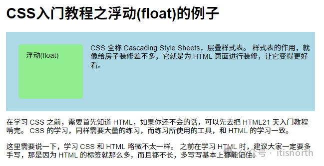 <div class="float-box-3">浮动(float)</div> <p class="first-p">   CSS 全称 Cascading Style Sheets,层叠样式表。   样式表的作用,就像给房子装修差不多,它就是为 HTML   页面进行装修,让它变得更好看。 </p> <p class="second-p">   在学习 CSS 之前,需要首先知道 HTML,如果你还不会的话,可以先去把 HTML21   天入门教程啃完。 CSS 的学习,同样需要大量的练习,而练习所使用的工具,和 HTML   的学习一致。 </p> <!--略去其它HTML内容-->
