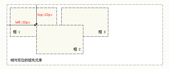 提示:相对定位实际上被看作普通流定位模型的一部分,因为元素的位置相对于它在普通流中的位置。 绝对定位是相对于父级元素而言的,也就是绝对定位必须由一个参照物(默认为父级元素)。 固定定位是元素绝对固定在某个位置。 四、应用场景1、相对定位相对定位是一个非常容易掌握的概念。如果对一个元素进行相对定位,它将出现在它所在的位置上。然后,可以通过设置垂直或水平位置,让这个元素“相对于”它的起点进行移动。 如果将 top 设置为 20px,那么框将在原位置顶部下面 20 像素的地方。如果 left 设置为 30 像素,那么会在元素左边创建 30 像素的空间,也就是将元素向右移动。 效果图: