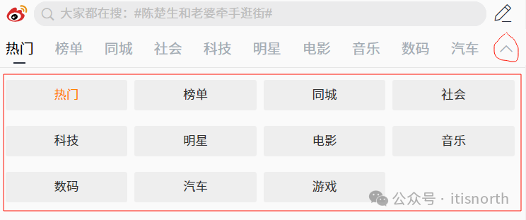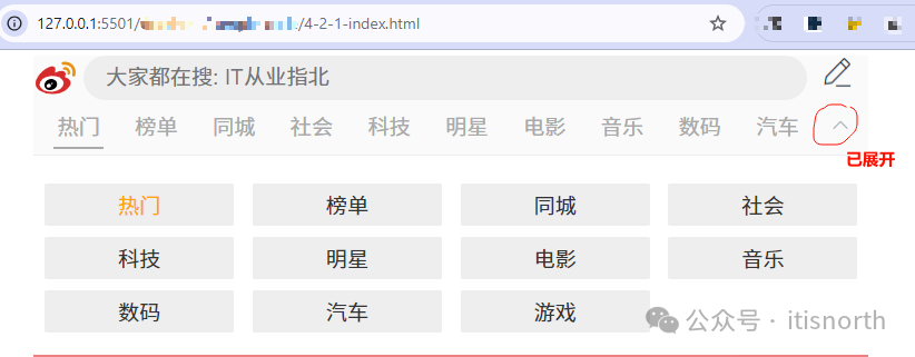<div class="nav"> <a href="#" class="selected">热门</a> <a href="#">榜单</a> <a href="#">同城</a> <a href="#">社会</a> <a href="#">科技</a> <a href="#">明星</a> <a href="#">电影</a> <a href="#">音乐</a> <a href="#">数码</a> <a href="#">汽车</a> <img id="menuControl" class="expand" src="../img/4-2-1-expand.png" onclick="toggleMenu()" width="30" height="30" /> </div>