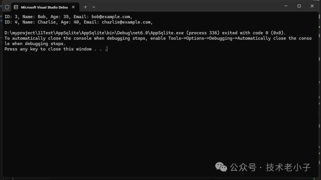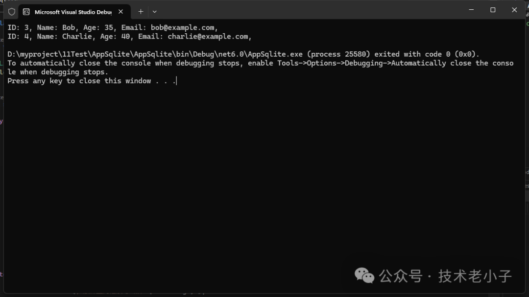 // 参数化查询 Console.WriteLine("\n25到40岁的用户:"); var parameters = new Dictionary<string, object> { { "@minAge", 25 }, { "@maxAge", 40 } }; SelectRecordsWithParameters(connection, "Users", "Age BETWEEN @minAge AND @maxAge", parameters);