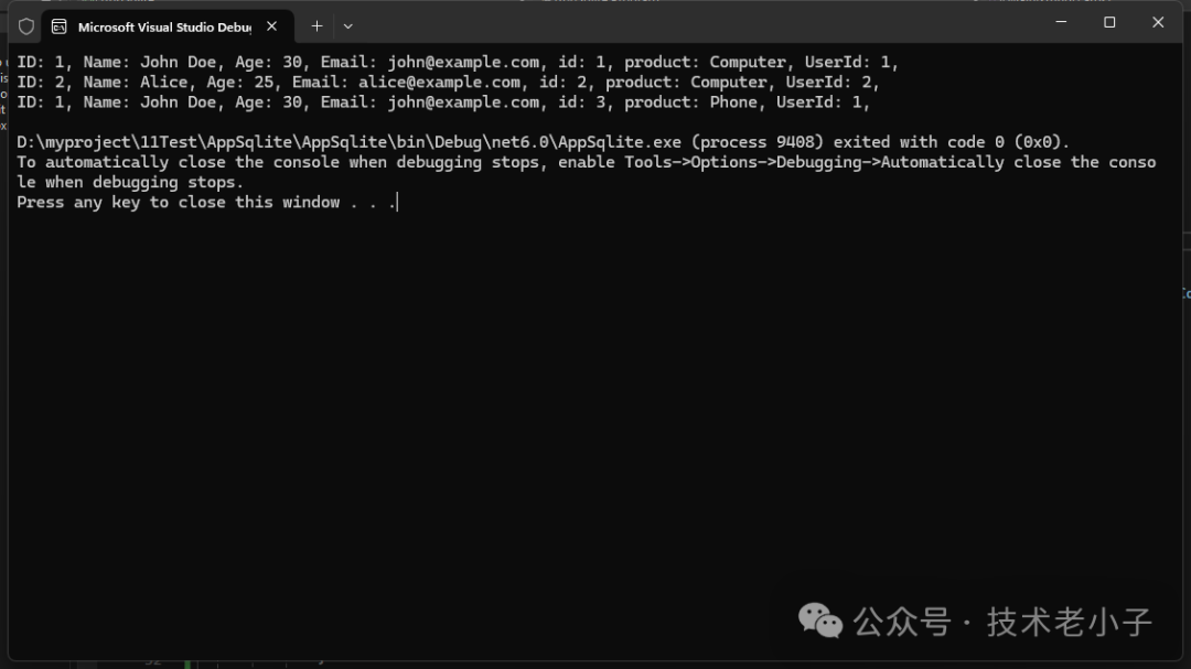 using (SQLiteDataReader reader = command.ExecuteReader()) { while (reader.Read()) { for (int i = 0; i < reader.FieldCount; i++) { Console.Write($"{reader.GetName(i)}: {reader[i]}, "); } Console.WriteLine(); } } } } catch (Exception ex) { Console.WriteLine($"参数化查询记录时出错:{ex.Message}"); }}