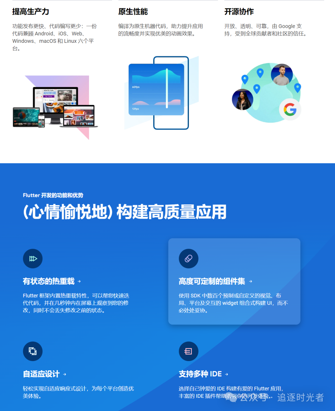 Flutter是由Google开发的一款开源、跨平台的UI(用户界面)框架,一份代码兼顾 Android、iOS、Web、Windows、macOS 和 Linux 六个平台,编译为原生机器代码,助力提升应用的流畅度并实现优美的动画效果。