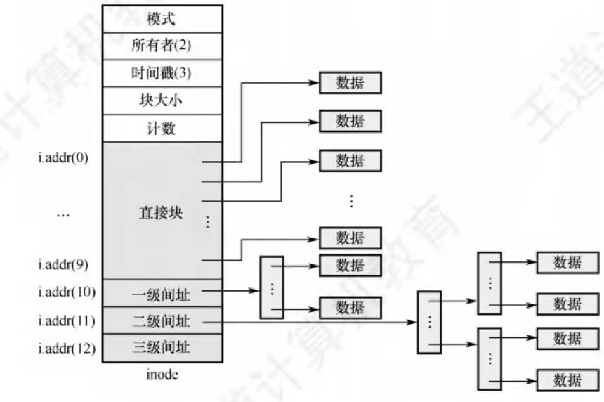 • 二级间接指针:指向一个索引块,该索引块中的每个指针又指向另一个索引块,这样可以指向 1024 * 1024 个数据块,共计 1024 * 1024 * 4KB = 4GB 的数据。