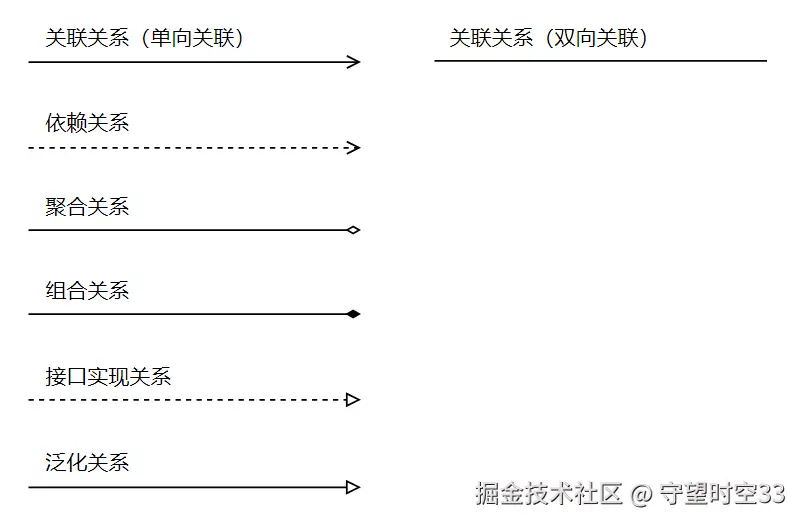 通常使用不同形状的箭头来连接两个存在一定关系的类,每种关系对象的箭头是不一样的: