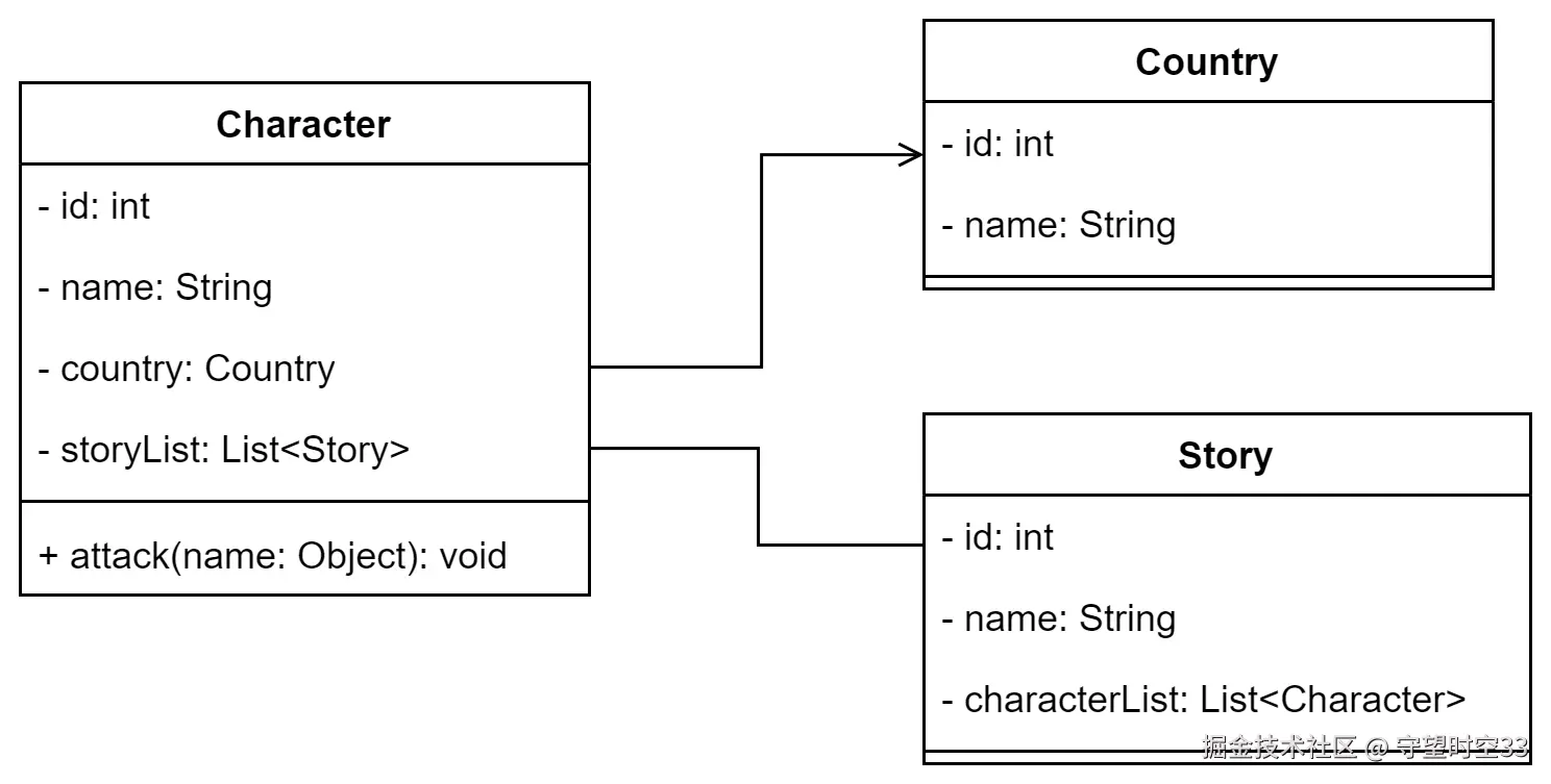 例如在一个游戏中,一个角色属于一个国家,国家与角色是一对多关系,一个角色关联一个国家;此外一个角色可以参与多个剧情,而一个剧情也包含多个角色,因此角色和剧情是多对多关系,角色与剧情则是双向关联的,表示如下: