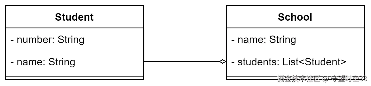 例如一个学校中有许多学生,但是学生可以离开学校单独存在,这就说明学生与学校聚合关系,表示如下: